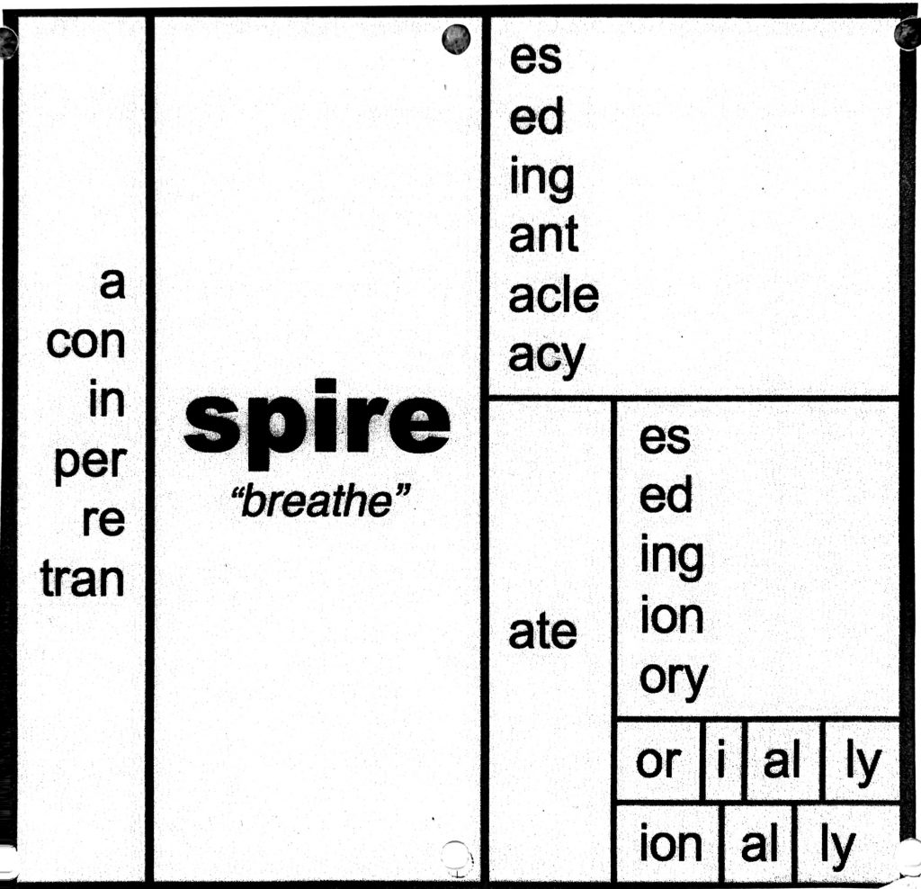 The most beautiful breeze breathes through my new house as I write. The emptiness of the house fills with cool air, and exhales, new again. Whenever I imagine breathing, I think of the <spir(e)> word family.